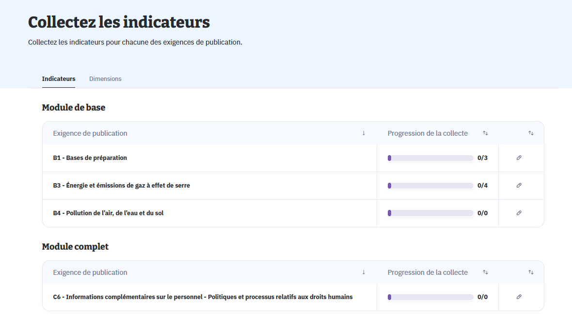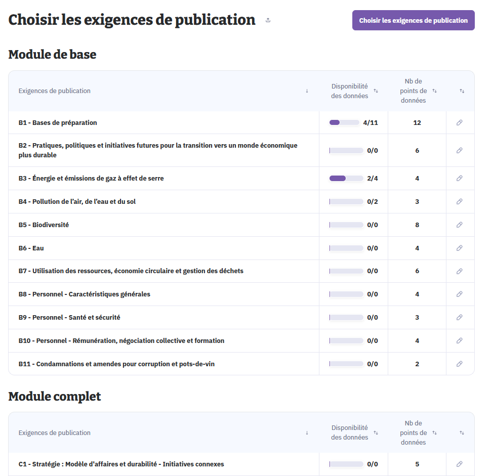 - Analyse d'écart : Vous pouvez choisir si vous reportez sur le module Basique uniquement ou aussi le module Complet puis sélectionner les indicateurs à reporter. Comme pour la CSRD, préparez votre reporting en indiquant si les données sont déjà disponibles ou si vous devez effectuer des actions