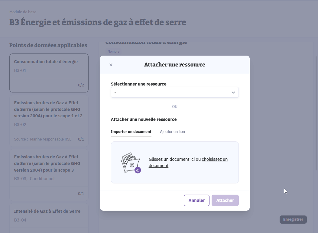 - Justification documentaire : Reliez facilement vos documents ou liens à chaque indicateur, pour une traçabilité optimale.