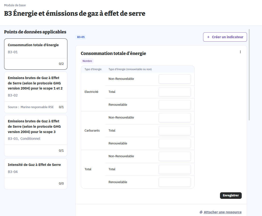 - Collecte des indicateurs : Comme pour la CSRD, vous pouvez saisir et centraliser tous vos indicateurs RSE pertinents pour le VSME.